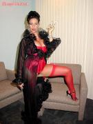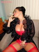 "Smoking in red corset and stockings"